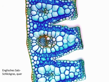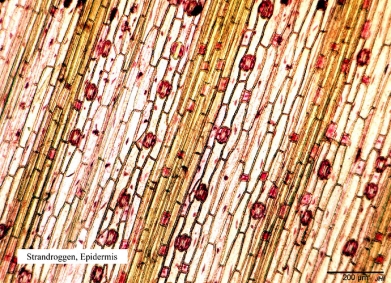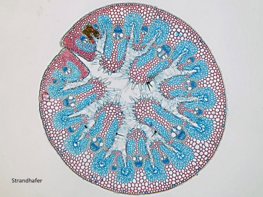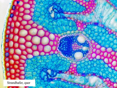 Die Querschnitte wurden mit Hilfe eines kleinen Tischmikrotoms, einer Wurzel und Bauhausklingen hergestellt. Färbung mit Astrablau-Chrysoidin-Alciangrün, gemischt.