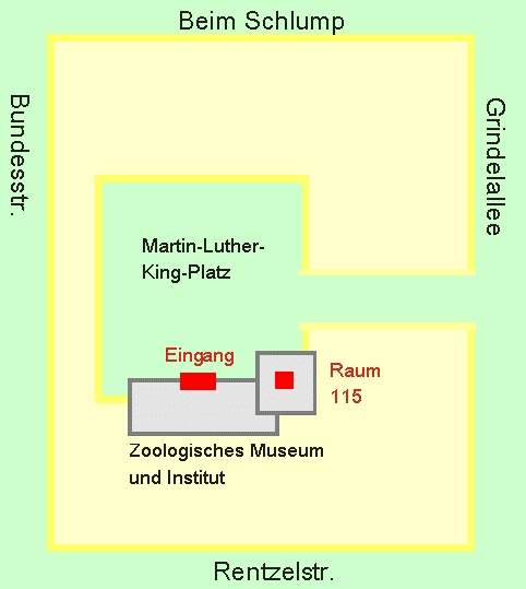Alle auf dieser Homepage angeführten Vorträge finden in den Räumen des Zoologischen Institutes statt: Centrum für Naturkunde (CeNak), Zoologisches Museum Kursraum 115 Martin-Luther-King-Platz 3 20146 Hamburg . |