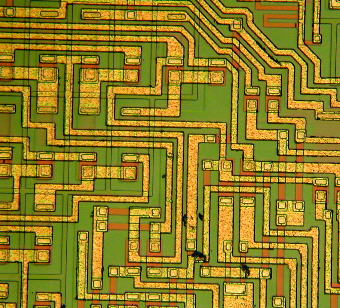Die nächsten Bilder zeigen die Oberfläche eines Chips. Die Leiterbahnen aus Aluminium leuchten goldgelb, aber auch die darunter liegenden Schichten erscheinen intensiv gefärbt, obwohl sie aus an sich farblosen Materialien bestehen. Es handelt sich hierbei um "Interferenzfarben", die immer dann auftreten, wenn weißes Licht sehr dünne Schichten durchstrahlt - von Seifenblasen sind derartige Farben auch aus dem Alltag gut bekannt. Tatsächlich sind die hier gezeigten Schichten auch sehr dünn, ihre Dicke liegt bei etwa einem Mikrometer. Ein geübtes Auge kann sogar mittels der Interferenzfarbe die Schichtdicke recht genau abschätzen, weshalb auch bei der Chip-Herstellung die Auflichtmikroskopie zur Prozessüberwachung herangezogen wird.