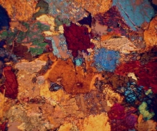 Wir geben hier nur drei besonders einfache Beispiele: Das erste und zweite Bild zeigt ein plutonisches Gestein, also ein Gestein, das aus einer flüssigen Schmelze auskristallisiert ist und daher ausschließlich aus Kristallen besteht. Das dritte Bild zeigt ein Sedimentgestein, also ein Gestein, das sich langsam aus verfestigten Meeresablagerungen gebildet hat. Deutlich erkennt man ein angeschliffenes Mikrofossil, zugleich zeigen die farbigen Körnchen zwischen den dunklen Sedimentpartikeln, wie sich nach und nach neue Mineralkristalle bilden. Noch einige hundertmillionen Jahre, und die Mikrofossilien sind verschwunden oder nur noch als sogenannte "Geisterstrukturen" erkennbar.