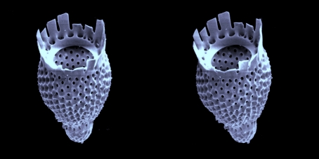 Figure 3 shows a stereo-pair taken with a scanning electron microscope (SEM). To get these images the object has been tilted by 5 degrees in both directions. The left image is assigned to the left eye, the right one to the right eye. To get a 3D-impression sit relaxed in front of the screen at a distance of about 80 cm and see "dreamingly" through the screen. The axes of your eyes will become parallel now and you will see two more images which more or less overlap. Suddenly with a"click" these two images merge and form a 3D-image hovering in front of the screen. Having been successful once this method will work everytime because in this particular case our brain learns very quickly what is demanded. But there is one restriction: The distance of the centers of the two images must be equal to the distance of our eyes (about 8 cm), so this method is unsuitable for larger images.